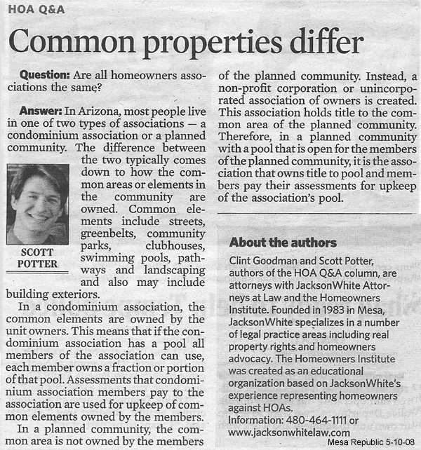 The concept of restrictive covenants (upon which planned communities and condominiums are based) dates far back into the history of the English common law. Restrictive covenants were originally ways for owners of land to control how the land would be used after it was subdivided. An owner could divide off portions of his farmland and include restrictions on the new owners, such as dictating that the new parcels would never be used for purposes other than farming or residential use, or prohibiting the sale of liquor on the land. This ensured that the original owner, who often continued to reside on a portion of the original parcel, controlled how his new neighbors would use the land. As the restrictive covenants became more specific and detailed, condominiums and planned communities eventually evolved. For the sake of brevity, moving forward to modern Arizona, you may also wonder why condominiums and planned communities are seemingly everywhere. Condominiums are an easier answer. They provide a means to own a home free from the maintenance headaches of owning a single-family house, and offer an affordable path to homeownership for individuals who are just starting out or have a lower budget. Condominiums exist because the market demands them and they are profitable to build and sell. The reasons for the proliferation of planned communities are not so obvious, and are based more on local government than on any market forces. Most, if not all, municipalities in Maricopa County require all new development of any real scale to be in the form of a planned community. The cities generally exercise this authority at the time they grant developers permits to subdivide parcels prior to developing them as single-family houses. Read complete article on "Why HOAs?"