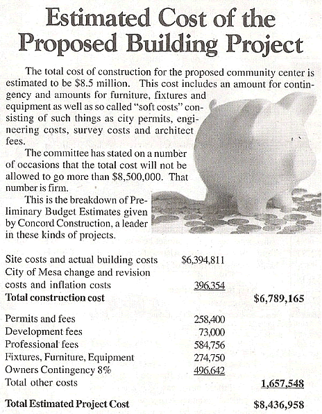 ___Cost of permits from the City of Mesa estimated at $258,000 with contingency of up to $396,000. The following is the text of a flyer that was distributed at the Town Hall Meeting by the Long Range Planning Committee. We leave it to you, the homeowners, to decide if this is what you want to support on February 21st. THE NEW APACHE WELLS COMMUNITY CENTER