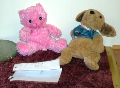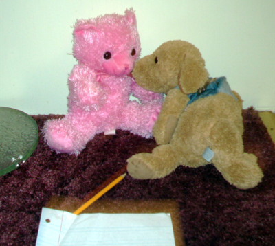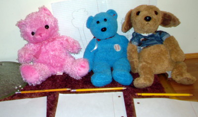 Pinkie Bear draws with pal's