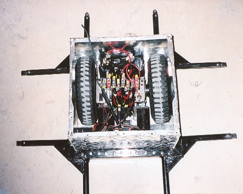The Midnight Express is a defensive design, which was made to be spinner proof and wedge proof. In combat, it faired well, but is a bit too slow. It is powered by 2 power window motors from a 1985 Chrysler, driving 9" pneumatic wheels. The electronics consist of servo/microswitch combos controlling 12v relays. The robot runs off a NiCd battery pack.