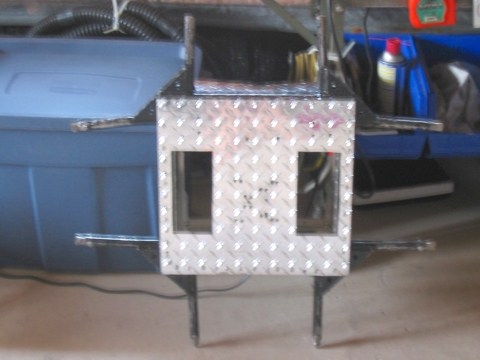 Visible in the pictures is the "external frame" construction method I used, consisting of 1" square steel tube and 3/4" round tube. In addition to making for a sturdy robot, the frame is what takes the punishment instead of the armour. All internal components are mounted onto a base plate that is attached to the frame.
