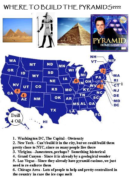 But where should we build them? I'm think Washington DC, somewhere in New York or Virginia, and maybe one near the west coast. Not California, though, they'll probably just have an earthquake and sink into the ocean (Atlantis, Part 2). I guess, next to the Grand Canyon, so maybe some stupid Historians will think Paul Bunyan and his bull(?) were gods or something and actually carved the Grand Canyon. I'm rambling now, I'd better stop.