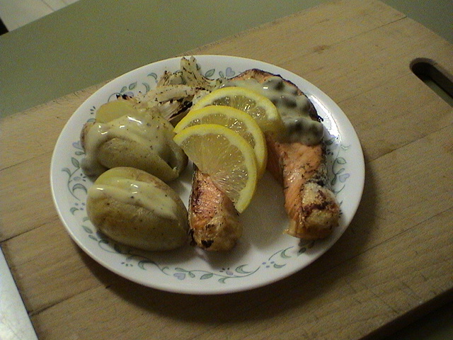 All that comes to mind is yum! This WAS salmon with a caper and mayonnaise sauce...I say was, because it was eaten so quickly I very nearly missed out on taking this photo of it!