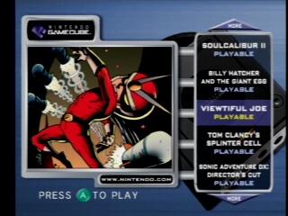 If you wanna look at it technically, all the playable demos are GCN-exclusives. Although you can find Soul Calibur II on the PS2 and X-Box, only the Cube version has Link(making it best by default). As for the multi-platform Splinter Cell, the GCN version has a huge advantage, GBA connectivity. The only thing I liked about the game is that you can use the GBA as a radar, and if I didn't have that, I would have died a lot faster and possibly more times. It did allow me to find a new route into the first building. Only it wasn't a secret route, it was the front door. See? I'm really bad at Splinter Cell.
