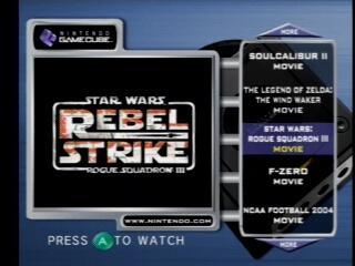 Now that I've reviewed all the playable demos, I'll take a very brief look at the videos. first up is F-Zero GX, which looks very nice, and the added F-Zero AX (arcade version) connectivity sound like a great idea. The Zelda video is just an explanation of how to use the Tingle Tuner to it's fullest ability. It is also home to a hilarious line: "Tingle is only as friendly as the person holding the GameBoy Advance, so choose your friends wisely" is spoken as various shots of Link getting blown up are displayed. The Rogue Squadorn III video make the game look very promising, and I like the idea of adding in a multiplayer feature. Best of all, you can crush Ewoks in an AT-ST! You can't improve on that! I don't plan on watching the football videos. The videos of the demo games are somewhat less enthralling than their playable cousins, but are good to watch none the less.