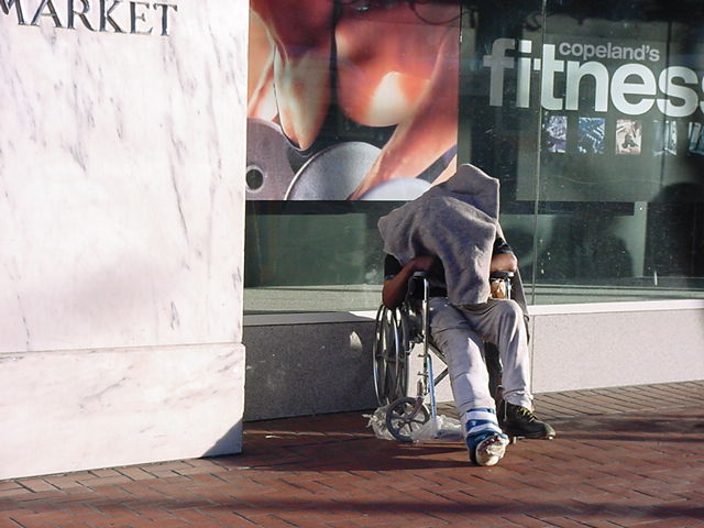 A guy napping outside of a Copeland's Sports. I wonder where he got that leg brace.