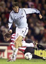 Haas made a vital tackle as Poyet burst onto Sheringham’s pass four minutes later and after another move involved Poyet and Sheringham, Craddock did enough to knock Ferdinand off balance as he shot.