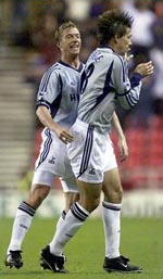 For a change it came from a long ball. Anderton knocked the ball into Ferdinand, the striker flicked on to the charging Ziege and his first-time cross was met by Sheringham, who buried from eight yards.