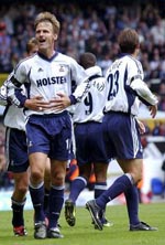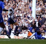 Typically, Chelsea then took the lead. The clock had ticked into injury time when a loose ball found Graeme Le Saux on the edge of the area. His shot was superbly blocked by Anderton but the ball span kindly to Lampard, who skipped away from Sullivan and cross for Hasselbaink to bury a header at the far post.