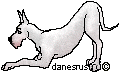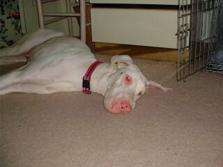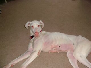 | Snowball is a deaf Great Dane who came to live with us on March 19, 2003, from the shelter. She was very, very skinny, and needed some TLC. She absolutely loves children and everytime she sees one she wants to go over and visit. She also gets along with other dogs. Every day Snowball improves and is having a great time playing with Baybe, Bonnie and Max. Snowball has a black spot near her right eye (I call it her beauty mark), and a few black spots near her tail. It appears at one time she had pups. Snowball's pictures hopefully will show her improvement over time. I hope you enjoy them. |