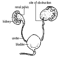 Blockage: this may occur at the kidney in the ureteropelvic junction (UPJ), at the bladder in the ureterovesical junction, or in the urethra (posterior urethral valve).