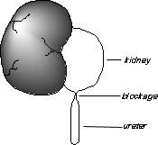 Hydronephrosis is a "stretching" or dilation of the inside or collecting part of the kidney. It often results from a blockage in the ureter where it joins the kidney that prevents urine from draining into the bladder. Urine is trapped in the kidney and causes the kidney to stretch. Hydronephrosis may also be due to abnormal backwash or "reflux" of urine from the bladder. In infants the amount of hydronephrosis may appear greater than the actual degree of blockage because of the "stretchiness" of the young tissues.