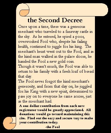 click here for a quick description on how Yahoo!PayDirect works along with a guarantee for security and privacy. make sure you put your Confirmation Code where it asks for your "message" so the Fool can thank you, and so he can mark you as a donator. Thanks! If you dont remember your code off the top of your head you can find it on the waiting list. ![]() click above to be reconnected to Yahoo!PayDirect's secure connection thanks |