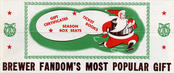 These logos could be found items as diverse as scorecards, schedules, the Brewer News newsletter, and game tickets. There were even seasonal variations, such as this Christmas Beer Barrel Man from 1944: