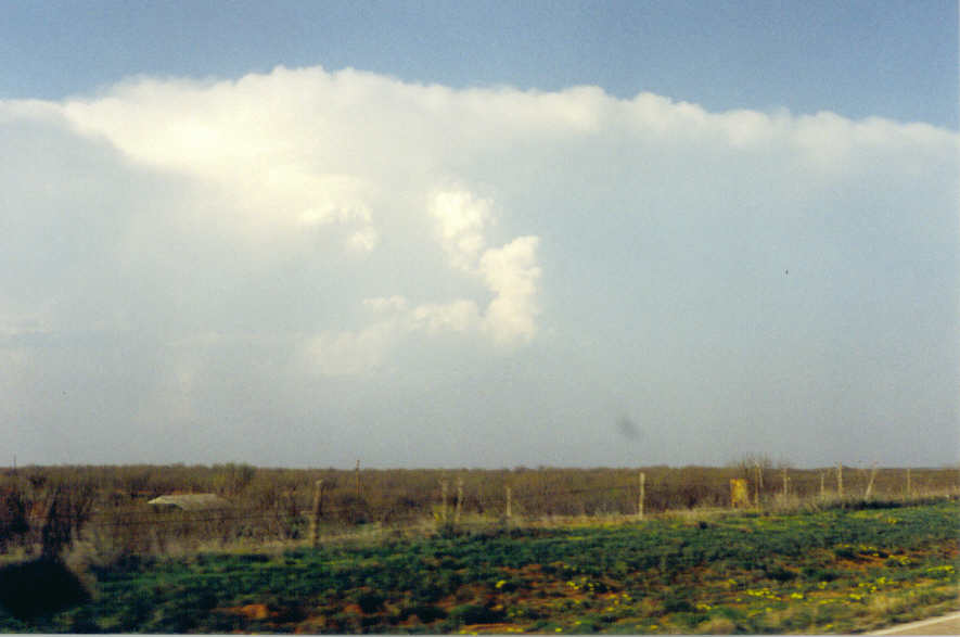 The mid-afternoon west-central Texas forcast discussion: Scattered t-storms will develop in west-central Texas this afternoon and tonight with some becoming severe. A warm and unstable airmass will continue across all of west-central Texas through this evening. A warm layer of air aloft is acting as a cap preventing t-storm development. However, as the dryline moves into the northwest big country late this afternoon there may be enough convergence to punch through this cap and allow rapid t-storm formation. Any storms that develop may quickly reach severe limits with very large hail and damaging winds the primary threat. However, it also appears that there will be sufficient shear throughout the atmosphere to make isolated tornadoes a threat as well. The area most likely to see any of these severe storms will be along and northwest from a Sterling City to Sweetwater to Haskel line. As a cold front overtakes the dryline late tonight and pushes across the remaider of west-central Texas more numerous showers and storms will be possible. Any of these storms may also reach severe limits, with large hail and damaging winds, once again, the primary threat. Spotter activation may be required. At 3:30pm we were 19 miles east of Abilene heading west. When we get about 10 miles east of Abilene I finally notice some crisp cumulus towers going up. The main one looked to be due west of us, probably somewhere near sweetwater. 4:12pm, stop at an allsup's in Merkel to get gas and food. The clouds we are watching have not broken through the cap yet they are still working on it, and moving rapidly northeast. We ran into a little slowdown just west of Merkel. We had to exit Dirstine road to go around a real bad traffic accident. Apparently a pickupran up under a semi. Both sides of the interstate were blocked off. It slowed us down about 15 minutes. At that time a