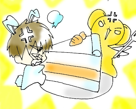 Dear Diary, Kero and I had a HUGE fight today! Sakura was giving us carrot cake for snacks, and we were all enjoying it happily and peacefully until we reached the last slice. Kero and I headed for it at the same time. We glared at each other for a whole five seconds, then Sakura left the room because of the tension between me and Kero. We started fighting for it. First we had a rock, scissors and paper battle. Then we went into staring contest. Kero won the first round. I couldn't help it! Kero looks so funny when he puffs his cheek! We were going to do wrestling when Sakura's brother came in. Kero pretended to be a stuffed animal. I followed him and pretended that I'm a stuffed animal, then I remember I don't have to pretend! I was diving for the cake when Sakura's brother said. "Mm...carrot cake." He picked up the cake and left! How dare he!! Not without a staring contest!! ~Syaoran the Rabbit |