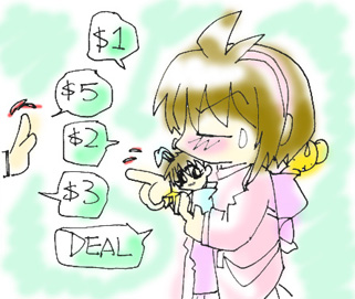 ![]() Dear Diary, I was writing a sale sign on my back, and added an extra zero on my price. Since zero means nothing, adding a zero to my price is bound to make me cheaper so that girl can buy me! Anyway, I didn't find normal tapes, but I did get my paws on some duct-tapes. I hope I won't pull my fur off when I have to take the sign off. The girl kinda got surprised when she saw the price on my back, I guessed adding a zero didn't make me cheaper, I'll try a one next time! She peeled off a bit of my fur when she ripped the sign off of my back secretly, that hurt really, really bad! She bargained and she bargained and she bargained. I guess she must really love me! She bought me with a price of "free" dollars! I guess that means I'm free! Yeah! I have an owner! And she told me her name is Sakura, and she gave me a name too! I am named after her boyfriend. Now I'm call Syaoran the Rabbit!! Yippi~Hm...I wonder what Syaoran looks like?? Maybe as handsome as I am! ~Syaroan the rabbit |