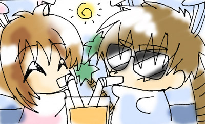 ![]() Dear Diary, This week, Little Sakura and I went to Hawaii for our honeymoon! It was a wedding gift from Tomoyo; she called the special pet travel agency, and arranged this wonderful vacation for us! ^w^ It was sure a nice honeymoon, the beach, the ocean, the carrot juice, and best of all, Little Sakura is with me! ^w^ But on the way, we met two strange friends...how strange? I'll tell you tomorrow when I have a picture of them!! ~Syaoran the Rabbit |