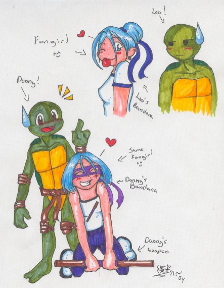 Silly TMNT fangirl Jewels pestering Don and Leo lol (Teenage Mutant Ninja Turtles)