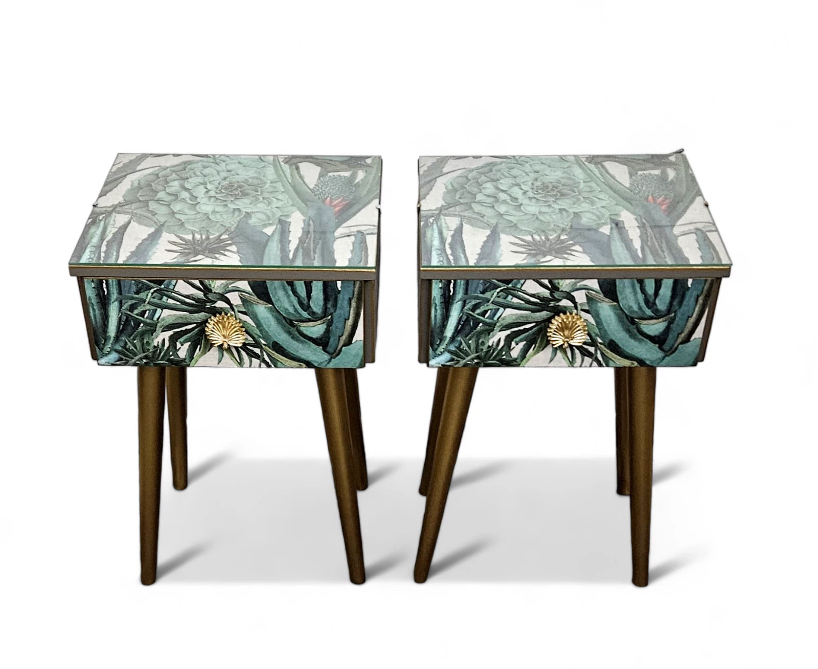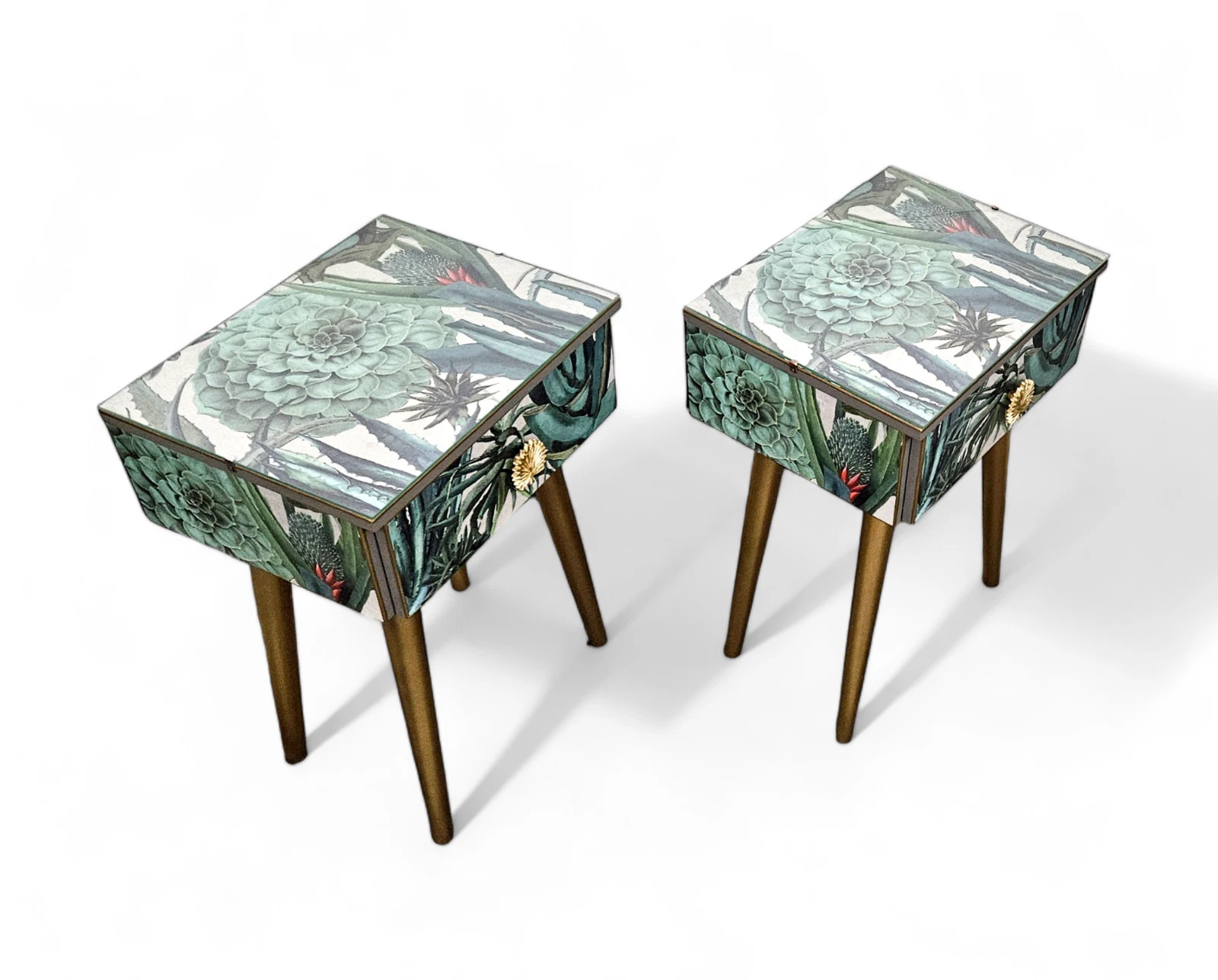 | Pair of Professionally Upcycled Mid Century Bedsides with Tropical Decoupage item number:296288039807 | |