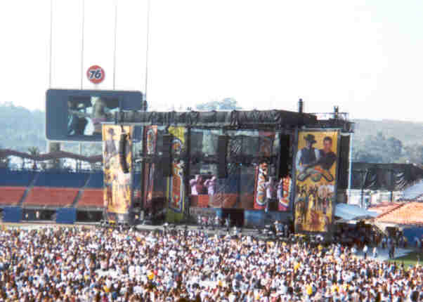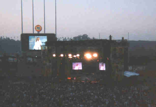 Okay, first of all, we left at about noon and got there about 15 minutes later. In the line to get into the parking lot that is! We had to wait 45 minutes to get in because a sewer drain burst! And it smelled really bad! But we got to talk to the people in the cars and most of them began honking and screaming and singing and dancing. We started waving our signs and cheering and whoopin' it up! :-) Eventually they got it fixed and we parked. We got a chance to see the KIIS FM bus and all the tents and interviewers! :-) Something happened though that made me VERY. They said no cameras, water bottles, or SIGNS! I mean, come on! What were we gonna do, start bashing old people over the head with it! I spent hours on my banners! For heavens sake I wanted to bring it! But nothing could stop be from bringing my camera. They had a lot of musicians there, but it wasn't until Will Smith came on and the party began! He sang a whole bunch of songs that totally rocked the house! The sound was sooo loud that I couldn't here myself scream! :-) After Will Smith came on, it was the fabulous 98*!!! They totally rocked the house! It was funny when they started singing "Pretty Fly For A White Guy!":-) Then, after a loong time of waiting, Ricky Martin came on! First he sang "Livin' La Vida Loca", "Shake Your Bon-Bon", Another song which I didn't recognize, but he said that the last time he came here he sang it and he couldn't resist but to sing it again, then the last song was "The Cup of Life"!At the very end of the song, an explosion of colored streamers filled the field (we were in the bleachers) and the show ended with the giant blow up people still dancing. No body could believe that it was over already!