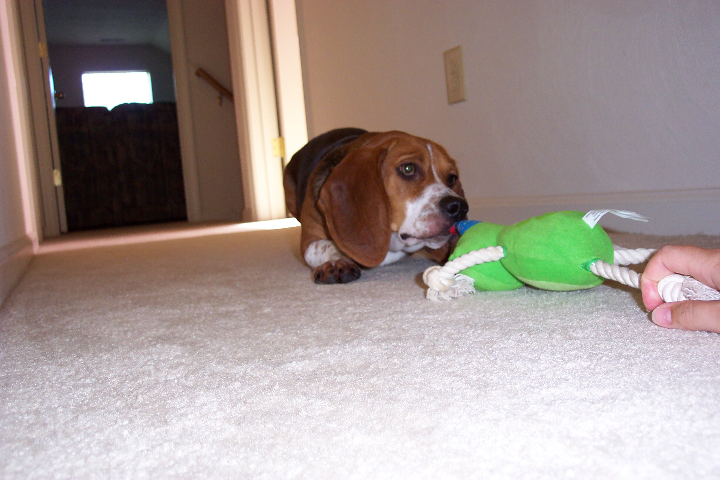 Here she is being gentle with her party frog, even though I am pulling on him. She is so cute!