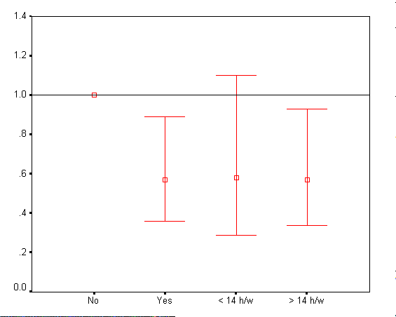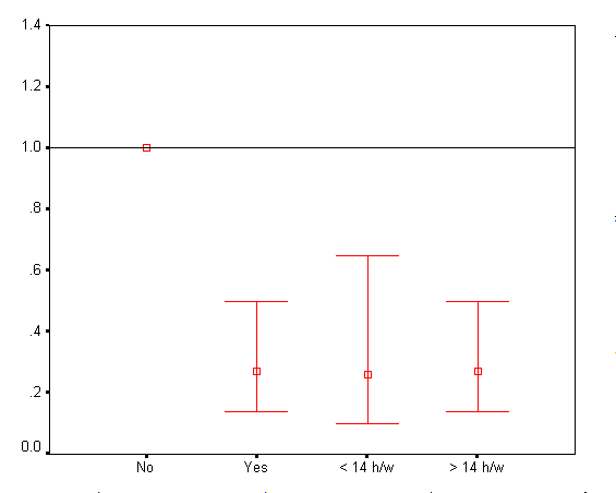 При множествената логистична регресия се установиха следните коефиценти на риска: при физическа активност < 14 часа/седмично, относителен риск – 0.09 /0.03-0.29/ и при физическа активност > 14 часа/седмично, относителен риск – 0.48 /0.23-1.00/.