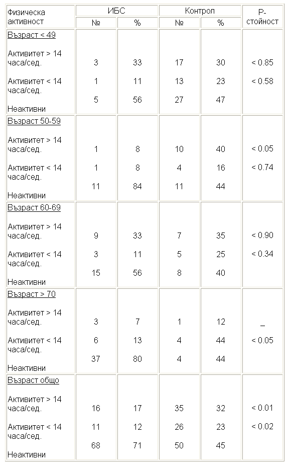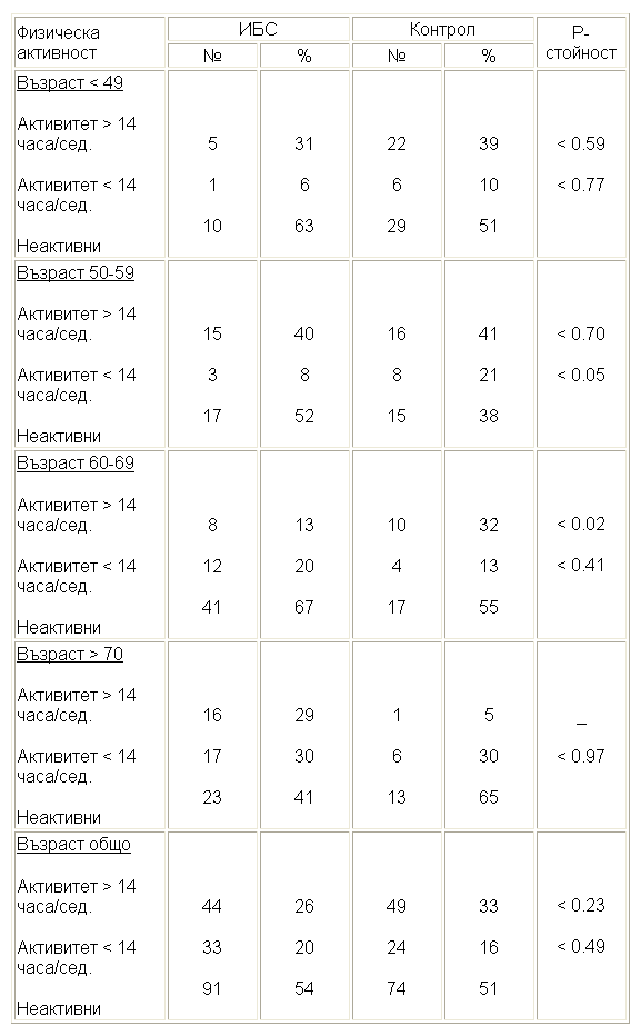 Структурата на физическата активност по възрастови групи и по пол е отразена на таблица 17 /мъже/ и на таблица 18 /жени/. На таблиците личи, че честотата на физически инактивитет при ИБС от двата пола е значително по-голям от този на контролните лица.