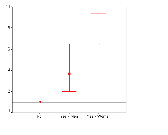 Взаимовръзката между безсъние и относителния риск за ИБС е отразено графично на фиг. 38 /odds ratio анализ и 95% доверителен интервал/. За референтни категории са взети лицата без оплаквания от безсъние. От фигурата проличава, че безсънието е рисков фактор при двата пола и асоциира добре с увеличения риск за ИБС. Относителния риск при мъжете е 3.7 /2.0-6.5/ и при жените е 6.5 /3.4-9.4/. И двата показатела са статистически сигнификантни.