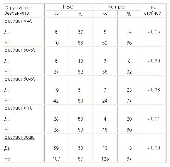 Структурата на безсънието на наблюдаваната популация, по възрастови групи, е отразена на таблица 21 /мъже/ и таблица 22 /жени/. От таблиците личи, че при болните с ИБС и при двата пола, във всички възрастови групи, честотата на разпространение на безсънието е по-висока от тази на контролите. Това се потвърждава и чрез статистическата оценка с Хи квадрат-тест, която показва значими различия, както в повечето подгрупи, така и в общата оценка между ИБС и контролите.