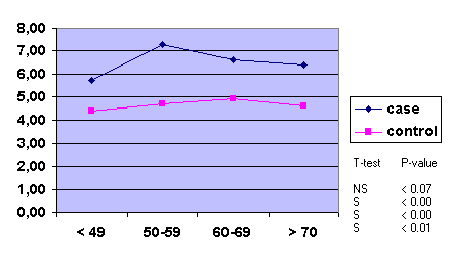 Статистическа оценка между ИБС и контролите на изнесените по-горе данни за кръвната захар е направена с Т-тест. От анализа проличава, че нивото на кръвната захар при болните с ИБС, във всички възрастови групи от двата пола, е значимо по-високо от това на контролите.