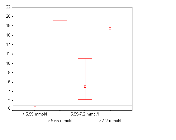 Взаимовръзката на рисково увеличените нива на глюкозата и ИБС е отразена графично на фиг. 41 /мъже/ и фиг. 42 /жени/. За референтна категория е използвана най-ниската концентрация на глюкозата – < 5.55 mmol/l. Изследван е относителния риск при ниво на глюкозата > 5.55 mmol/l; 5.55-7.2 mmol/l и > 7.2 mmol/l. От фигурите личи, че при всички рисково увеличени нива на глюкозата при двата пола е налице висок относителен риск за ИБС. Всички илюстрирани стойности и при двата пола са статистически значими.