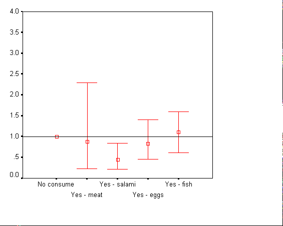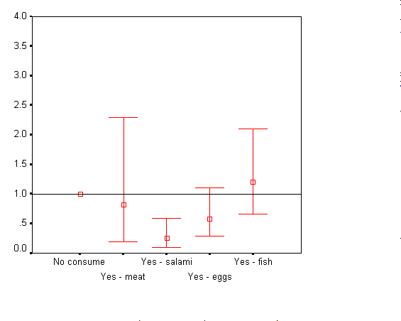 Взаимовръзката между консумация на белтъчни храни и относителния риск за ИБС е илюстрирана графично на фиг. 47 /мъже/ и фиг. 48 /жени/. От фигурите проличава, че коефицентът на риска при консумация на месо, колбаси и яйца показва умерено протективен ефект върху ИБС. При консумация на риба коефицентът на риска се движи плътно до единицата. Статистически значими са единствено показателите при консумация на колбаси.