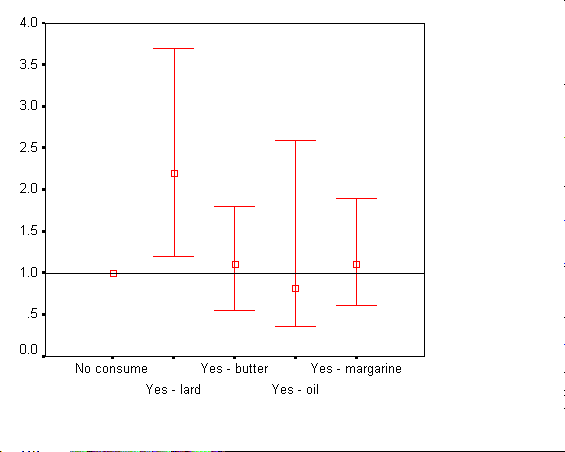 Взаимовръзката между консумация на мазнини и рискът за възникване на ИБС е представена на фиг. 49 /мъже/ и фиг. 50 /жени/. От фигурите личи, че при консумация на животински мазнини е налице, както при мъжете така и при жените, висок относителен риск за възникване на ИБС. От друга страна консумацията на млечни мазнини при мъжете има умерен протективен ефект.