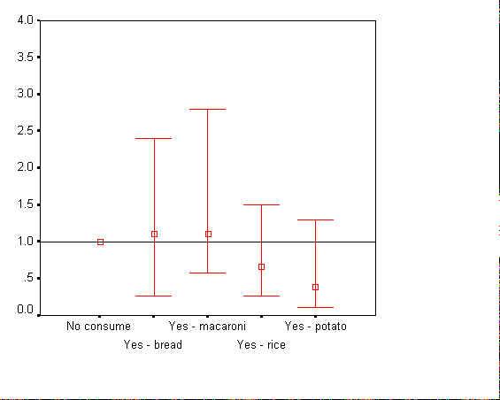 Взаимовръзката между консумацията на въглехидратни храни и риска за възникване на ИБС при мъжете е отразена графично на фиг. 51. От нея личи, че при консумация на хляб, макарони и картофи относителния риск за възникване на ИБС се движи около единицата. Единствено при консумация на ориз се установява протективен ефект. При жените взаимовръзката между приема на въглехидратни храни и ИБС е отразена на фиг. 52. От фигурата личи, че при консумация на ориз и картофи е налице протективен ефект, но тези стойности не са значими. При прием на хляб и макарони относителния риск се движи около единицата.