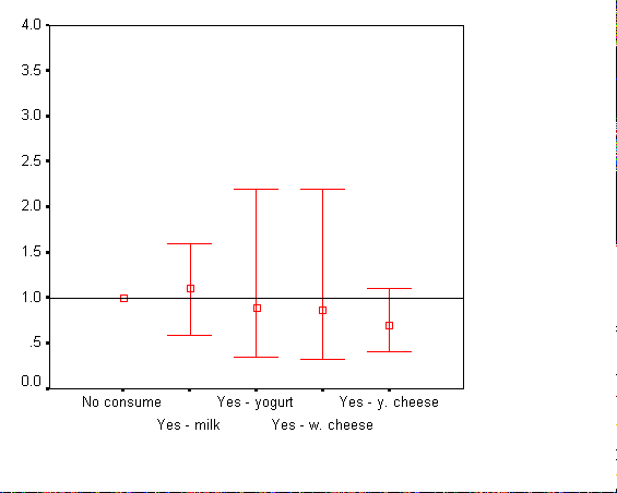 Фигура 53: Взаимовръзка между консумация на мляко и млечни продукти и ИБС: Odds ratio и 95% доверителен интервал - мъже