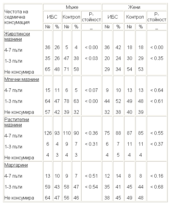 Честотата на седмична консумация на предимно мазнинна храна е представена на таблица 26, фиг. 49 и фиг. 50. Проследен е приемът на мазнини от животински, млечен, растителен произход и маргарин. От таблицата се вижда, че при болните с ИБС, по отделно при мъжете и жените, е налице съществено висока консумация на животински мазнини. При консумацията на останалите мазнини различията с Хи квадрат-тест не са значими между опитните и контролните лица.