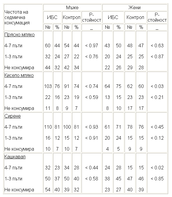 Структурата за честота на седмична консумация на мляко и млечни продукти и съответната статистическа оценка при ИБС и контроли е отразена на таблица 28, фиг.53 и фиг.54. Проследяват се храните прясно и кисело мляко, сирене и кашкавал. От таблицата личи, че единствено при жените консумиращи 4-7 пъти седмично кисело мляко и кашкавал са налице статистически значими различия спрямо контролите.