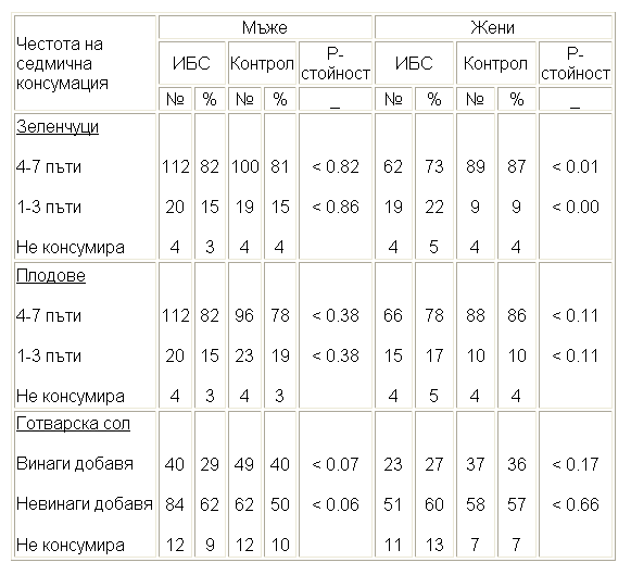 Най-сетне на таблица 29, фиг. 55 и фиг. 56 сме представили структурата на седмична консумация на зеленчуци, плодове и готварска сол. От таблицата личи, че при жените с ИБС честотата на консумация на зеленчуци е по-висока от тази на контролите. При мъжете не се установяват значими различия в консумацията на зеленчуци между опитните и контролни групи. Данните за прием на плодове и при двата пола не показват различия между опитните и контролни групи.