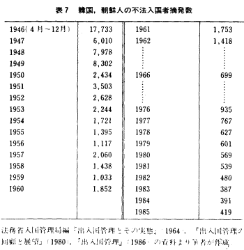 サンフランシスコ講和条約発効以後大韓民国からの不法入国が在日朝鮮人の親戚を頼るなどの形をとって行なわれたが、その実数は把握できない。検挙された者の数のみを表7に示すが、密航に成功した者がどれだけいるか定かではない。成功したものは後になって特別在留という形で在留を許可されろケースもあるが、不法入国のままの者もいると思われる。 隣国韓国から日本には実に容易に行けるので、密航の取り締まりは簡単にはいかない。夜の日本海には大小無数の漁船が浮かんでおり、海上保安庁の係官は挙動不審の船を彼らの勘でかぎ分け、その船のみを取り調べるという。 しかしながら、密入国者が日本で生活を続けるためには彼らを援助する親戚・知人が必要であり、また日本語能力と関わって働く場所も限定されるので、密航者家族の生活は勿論のこと、単身者での生活も容易でないことが想像される。 1945年 終戦 1948年 大韓民国成立 1948年 朝鮮民主主義人民共和国成立 1950年 朝鮮戦争勃発 1952年 サンフランシスコ平和条約発効 |