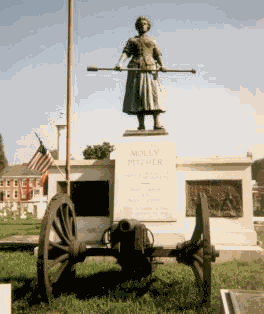 "O’er Monmouth’s field of carnage drear, With cooling drink and words of cheer A woman passed who knew no fear, The wife of Hays, the gunner. With ramrod from her husband’s hand, Beside his gun she took her stand And helped to wrest our well-loved land, From England’s tyrant King. From the ranks this woman came, By the cannon won her fame ‘Tis true she could not write her name, But freedom’s hand hath carved it. Shall we then criticize her ways, Nay, rather give her well earned praise Then doff our caps and voices raise, In cheers for Molly Pitcher." - Sarah Woods Parkinson -