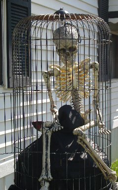 Here is a skeleton sitting in an old bird cage that I spray painted black. (see the UFO page to see how I used the bottom of the cage).