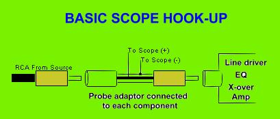 Moreover, you'll need a "device" to dropp the signal by 40dB. This can be found at Radio Shack. It's a set of red plugs that go in-line of your RCA cables. You need this because if you'll be hooking up the scope at the speaker outputs of the amp or if your decks RCA autput is 5 V or higher, you may damage your scope! So, if you have a crappy deck that has an RCA output of 2.0V, you would plug these just before the amp's RCA input, but if your deck or Line Driver puts out 5V or higher, you'd plug it in just after that componet having high RCA output.