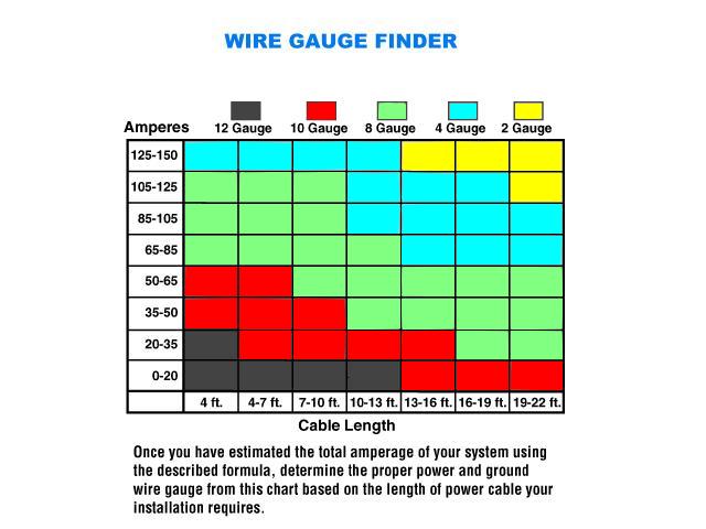 To determine the approximate current-draw (in amperes) of your amplifier (or amplifiers) divide your total RMS power rating by your total peak power figure. Multiply this figure by the fuse rating of your amp (or the total of the fuse ratings of all your amps). Compare this number to the numbers in the "Amperes" column in the chart below. Cross-reference with the cable length (the distance from your battery to the amp mounting location) to determine which gauge of cable you need.