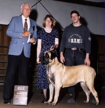 These are my first two Mastiffs. On the left is Brite Star's La Osa Grande winning Best Opposite Sex and CH Britestar's Mucho Grande winning Best of Winners (prior to finishing his championship).