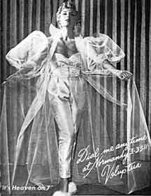Between breaks, Voluptua shows us around her apartment. There's the telephone (trimmed in mink, of course) that doesn't ring, but sings softly, "Voluptua. . . Voluptua." She has a large, heart-shaped Book Of Secrets from which she reads the experiences of great lovers of history and what women like Cleopatra, Helen of Troy and Madame DuBarry did to attract and hold their men. |