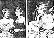 From 1954 to 1955, Gloria Pall reigned as KABC's gorgeous goddess of love, hostess to the station's romance movies from 9:30 PM to 11:00 PM. Starting on December 15, 1954, early TV viewer's had to cool off their sets while the stunning Miss Pall entertained them as Voluptua.Voluptua would enter to swelling theme music. Blonde, in a gold lame' evening gown, she enters dragging a fur behind her on the floor. From her seat on her crescent lounge in her "loving room", you see she is surrounded by silks and drapes that hang from the ceiling, cushions and animal skins are strewn about. There are ashtrays shaped like golden cherubs, a telephone stand shaped like a large bejeweled, white-gloved hand, along with a giant heart-shaped chandelier. |