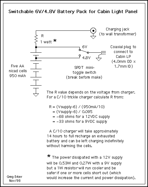 Warning: Do not attempt to charge this type of (switchable) nicad pack with a quick charger. Quick chargers for batteries (rather than cells) depend on all cells in the battery being at basically the same level of discharge. With my pack design the top cell is less discharged if you have used the 4.8V setting. Thus a quick charger will overcharge the top cell damaging it, possibly causing leakage. My trickle charge approach avoids this problem because even fully chaged cells can withstand a C/10 current (95 mA for a 950 mAh cell) indefinitely without damage. Thus the top cell will not be damaged even if still fully charged when the bottom four are fully depleted, and then charged.