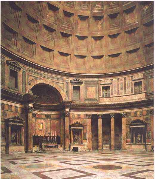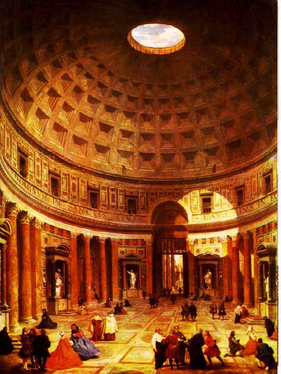 The Pantheon (not to be confused with the Parthenon!) is from Imperial Rome. In art class I learned how to remember the difference between the two. The Parthenon is highly decorated on the outisde since that's where a majority of the people were. The Pantheon, on the other hand, had it's main focus on the inside. On the exterior it has a later Corintian order with the colums, pediment, and dome. It has a very large scale exterior and looks powerful and overwhelming.