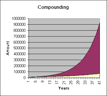 The magic of compounding is graphically illustrated by the ever increasing slope in the later years compared to the little difference in the early years. It is so dramatic that just one year more year past 40 would produce over $100,000 more, without adding any more money! And every year thereafter the increases are even greater. This explains how the rich get richer, but, even more important to understand, it shows that this is available to anybody who starts early and wants to retire with enough money to live comfortably. It's never to late to begin. Teachers can do it so easily if they just begin and stick to a good plan.